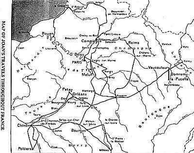 Map showing Joan's travels throughout northern France