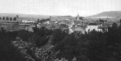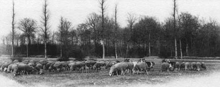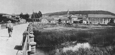 6) This is a general view of the village Greux (foreground) Domremy (mid-ground) and the Basilica of Saint Joan of Arc at the Bois-Chenu. (background - the steeple of the basilica can be barely seen on the horizon - right of the picture.) [1905.]