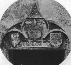 5) This carving is over the main door to Joan's home. It shows three coats of arms: King Louis XI (center), the Thiesselin family (left), and the de Lys family (right) with the date of 1481. It is believed that in 1481 King Louis paid the Thiesselin family to restore Joan's home. The Thiesselins had married into the de Lys family. [1905]