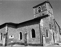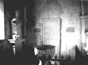 8) This photo shows the baptismal font and the Thiesselin brothers' burial monument. [TF 1984]