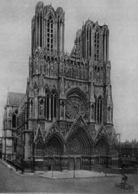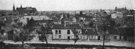 General view of the city and cathedral of Reims. The church in the background on the left with the two spires is the Church of Saint-Remi. The church in the background on the right with the square towers is the Reims Cathedral. [1905]