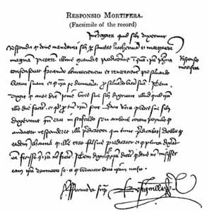 Photo copy of one page from Joan's trial record. Note in the right hand margin the Latin words, responsio mortifera, which mean, "fatal answer." [1905]