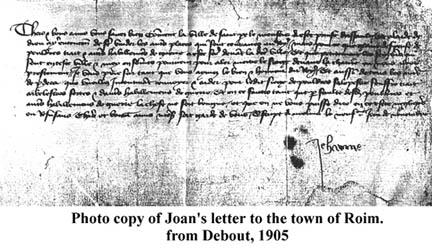 – Jehanne dictates a letter to Reims. She says "Very good and well beloved friends whom I wish greatly to see again, Joan the Maid has received your letters, which mention that you fear that you will be besieged. Know well that you should not be distressed if I can confront them (she means the Burgundians). If they come near, shut your gates, for I will be very direct with you; if they come I will make them fasten on their spurs so fast that they will not know how to put them on and get out of there, and very quickly at that. I will write you nothing more at present, but pray remain good and loyal. I pray God to keep you safe." The original letter is still preserved and carries Jehanne’s own signature.
