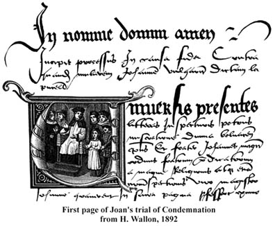– Jehanne is again pressed on the matter of her sign to the King. "Would you be content if I perjured myself?" Asked whether she had sworn and promised St. Catherine not to tell this sign, she answers: "I have sworn and promised not to tell this sign, of my own accord, because I was too much pressed to tell it " And then she promises to herself not to speak of it further to any man.She then goes on to present an elaborate story of an angel bringing a crown, made of the finest gold, to the King. Most people doubt this story. Jehanne was repeatedly pressed on every side before literally being backed into a corner of her cell told this story. On February 27th she stated that she was not aware of an angel when she met the King. She repeatedly deferred comment until she asked them today "would you be content if I perjured myself?" Apparently they would. One aspect of the story that might give Jehanne away. She says that the Jean D’Alencon (along with her dropping many other important names) was present at the first meeting of the King. Jehanne should have remembered that she did not meet "her good duke" until a couple of days after first meeting the King. Of course, the English have no way of knowing this, and when dropping names, why not more the merrier? There also is a story that in 1377 Richard II entered London to become king and an angel descended to offer him a golden crown. Perhaps Jehanne heard this story and is using it for her own purposes.