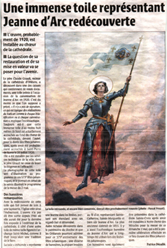 Father Claude Girault, rector of the Cathedral of Orleans, discovered in a chest of old documents, a canvas painting for Joan of Arc's 1920 canonization. At least, that's what one supposes right now. There's no signature, which is typical of other such works from the Vatican which mark beatifications or canonizations, explains one cleric. The fact remains that, after having been hung probably in Saint Peter's in Rome the 20th of July, 1920, the immense canvas currently decorates the choir of the cathedral, before the altar, (and will remain there) for the rest of the Joan of Arc festivities, Father Girault cannot say enough about the diligence and efficiency of the city workers who installed the painting.