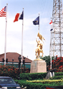 The people of France gave the golden bronze statue of Joan of Arc to the City of New Orleans in 1972. (Note: This statue is an exact copy of the famous 1880 Emmanuel Fremiet equestrian statue of Joan located at Place des Pyramides, Paris.) This statue was originally located in front of the International Trade Mart building but it was moved in 1999 to its present location of the 'Place De France" on Decatur Street in the French Quarter next to the French Market on Decatur Street.